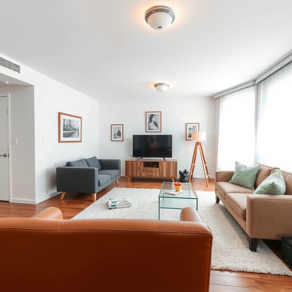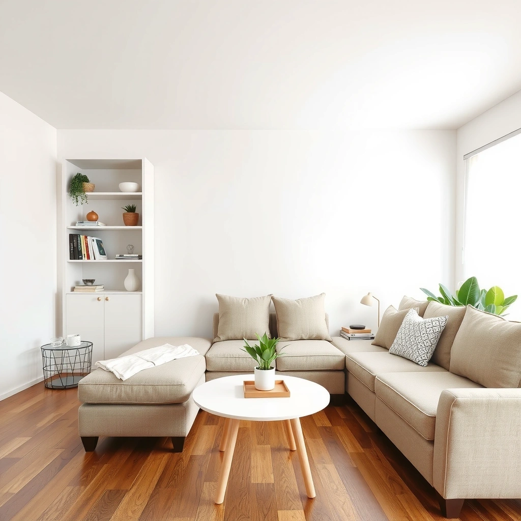 Complete living area transformation with sofa deep cleaning, hardwood floor polishing, and decorative item organization.